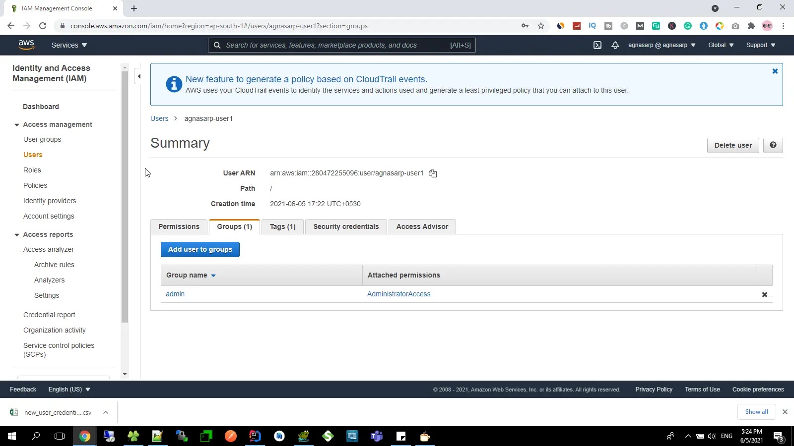 Step 10: Check Permission, Groups, Tags, and Security credentials, etc. of the new user